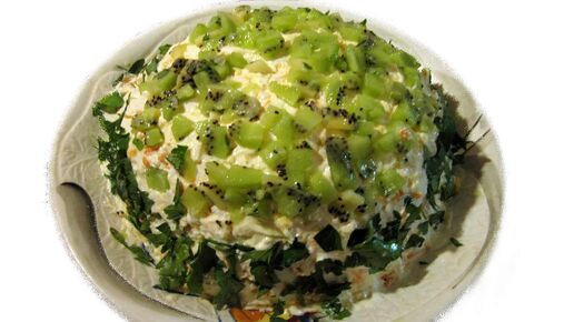 Праздничный слоёный салат с курицей и грибами (без картофеля).