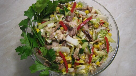 Здравствуйте, уважаемые подписчики и гости моего канала. Предлагаю вашему вниманию простой рецепт очень вкусного, сытного и сочного салата, который, если у вас есть отварное мясо, можно приготовить за несколько минут. Хотя и мясо можно заменить ветчиной или другим мясным продуктом, что есть под рукой. Получается он всегда на отлично и его вид позволяет ему занимать место даже на праздничном столе. Итак, переходим к ингредиентам. Для приготовления нам понадобится (в моём варианте): половина пекинской...