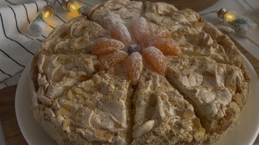 Здесь очень интересные коржи, они двухслойные. Первый слой – это слой, можно так сказать, бисквитного теста, хотя не совсем оно бисквитное с цедрой апельсина, второй слой – безе. И посыпается это всё миндальными лепестками или любыми орешками. В результате коржи получаются очень интересные по вкусу и очень красивые по текстуре. И прослойка из апельсинового варенья ю, . Иногда берут малину, хотя, на мой взгляд, здесь подойдут абсолютно любые ягоды. И легкий крем на основе взбитых сливок. В результате получается очень вкусный, очень лёгкий, воздушный, очень красивый торт...