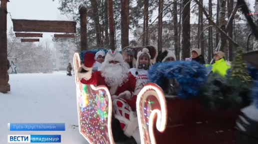 В Новый год происходят чудеса. Вот, например, жители Гусь-Хрустального в это точно верят. Ведь к ним каждый год Дед Мороз приезжает на необычных сказочных санях. Репортаж Веры Куликовой. Вот такие сказочные сани Деда Мороза ежегодно появляются в Новый год в Гусь-Хрустальном. - Ждала дедушку? - Да. А стихи выучила? - Нет. - Песенку может знаешь? - В лесу родилась елочка , в лесу она росла... Настоящие чудеса происходили в этом году в парке с говорящим названием "Сказка". Здесь ожили персонажи из народных сказок и вместе с детьми и взрослыми встали в хоровод...