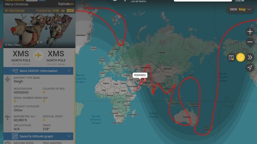 В типе воздушного средства указано «сани», регистрационный номер судна — «Хо-хо-хо». Сейчас Санта движется с очень большой скоростью — около 3300 км/час, чтобы успеть посетить все места и раздать подарки. С секретным маршрутом, известным только двум людям — Санта-Клаусу и миссис Клаусу — мы можем только предполагать, какая страна станет следующей, — сообщение Flightradar...