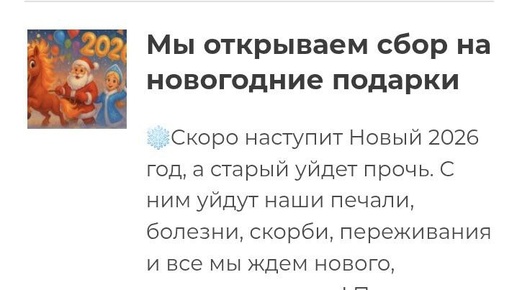 ✨Открываем сбор на новогодние подарки ❄️Скоро наступит Новый 2026 год, а старый уйдет прочь. С ним уйдут наши печали, болезни, скорби, переживания и все мы ждем нового, новогоднего чуда! ❄️Чуда ждут не только взрослые, которые когда-то были детьми, но и сами дети, которые когда-то тоже станут взрослыми.✨ ❄️ Все ждут подарков, внимания и заботы. Но, не у всех это получается и не у всех эта забота и внимание есть. В этом году мы снова, как много лет назад, открываем сбор новогодних подарков для...