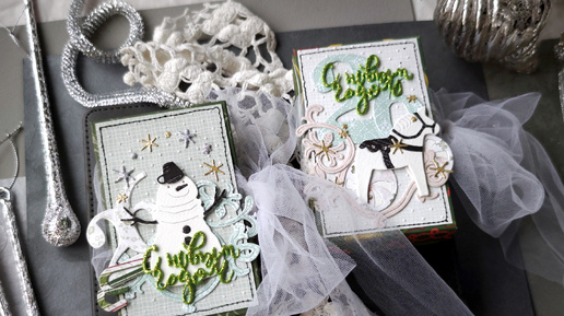Привет, с вами Надя! После нашего коробочного сп меня у меня наступила влюбленность в коробочки! Сделала новогоднюю парочку с милейшим снеговиком - жонглером и символом года - лошадкой )) Завиток и рамочка "Страдающее средневековье" ловко имитируют снежные узоры. "Снеговика" и лошадку "Хюгге" вырубила многократно и склеила в виде объемного чипборда...