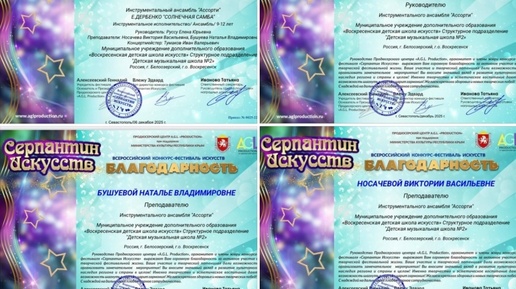 Стали известны результаты Всероссийского конкурса-фестиваля «Серпантин искусств», прошедшего в онлайн-формате с 2 по 5 декабря. Инструментальный ансамбль «Ассорти» МУДО «ВДШИ» СП «Детская музыкальная школа №2» г. Белоозерский Лауреат 1 степени 🏆 Руководитель Елена Юрьевна Руссу Преподаватели Виктория Васильевна Носачева, Наталья Владимировна...