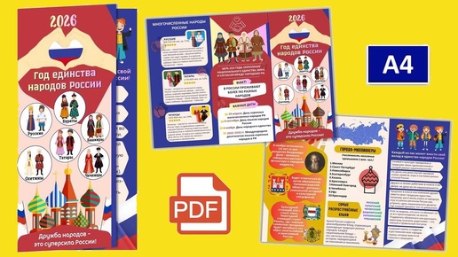 Дизайн: яркий, в цветах триколора, с наглядными иллюстрациями и доступным текстом. Суть: кратко рассказать о том, как в нашем культурном богатстве рождается общая сила. Формат: буклет-«гармошка». В комплекте — готовый PDF (2 страницы) и инструкция по печати на А4. Шаблон адаптирован для совпадения сторон. Для распечатки на любом принтере. Для кого: ученики 1–11 классов, библиотеки, культурные центры...