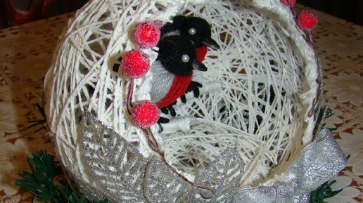 Снегири. Новогодняя поделка в сад или школу. Поделка из ниток. Снегири из ниток. Шар из ниток и ПВА