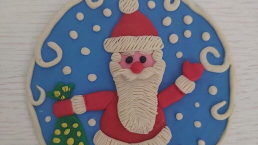 Новогодний ёлочный шарик из пластилина на картоне "Дед Мороз". Пошаговая инструкция с фото для детей.