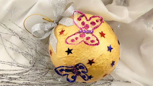 Новогодний золотой шарик с бабочками с нуля из бросового материала