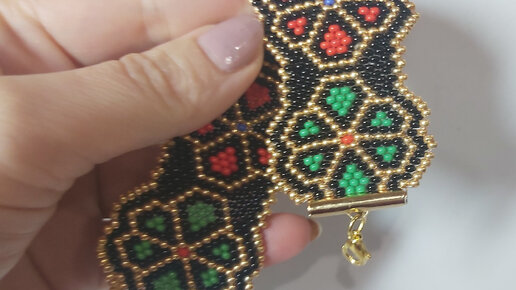 Здравствуйте, дорогие мои друзья! Сегодня предлагаю вам схему браслета из бисера в технике кирпичное плетение. Самодельный бисерный браслет - оригинальное украшение, которое приятно не только носить, но и плести. Для работы вам понадобятся игла, нить или леска для бисероплетения, карабин и 2 соединительных колечка, 2 концевика , бисер: красный, золотой, черный, зеленый, синий. Начинала работу с первого ряда Плетите браслет на нити удобной для вас длины, по необходимости нить подплетайте...