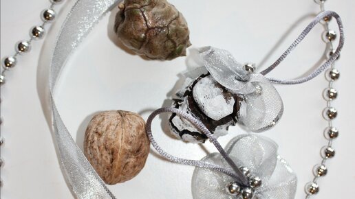 Мастер-класс К Новогоднему празднику так хочется украсить дом и ёлочку новыми игрушками! Но к сожалению, цены на елочные игрушки порой выходят за грани разумного. В этом мастер-классе я расскажу, как сделать симпатичные и недорогие игрушки на ёлку своими руками. 1. Подготовим все необходимые материалы. Нам понадобятся: шишки или орехи, размер шишек зависит от размера ёлки. У нас ёлочка маленькая, 90 см, поэтому подбирали небольшие шишки и грецкие орехи. Акриловая белая краска и кисть, небольшая тарелочка, чтобы было удобно разводить краску...