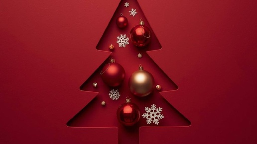 Реалистичное изображение с глубоким красным фоном, на котором размещён минималистичный силуэт рождественской ёлки, вырезанный по контуру