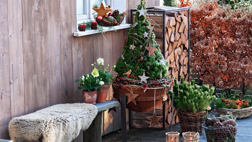 Любимый сад спит и видит белые сны… Давайте сделаем их цветными! Новый год и Рождество — прекрасный повод украсить террасу и поднять градус настроения в царстве холодной зимы. Величавой королевой выглядит в праздничном уборе ель канадская (Picea glauca) ‘Conica’, посаженная на круглый «трон» и увенчанная золотыми звездами. Подножье деревца украшено светящейся гирляндой и ярким венком из ветвей декоративной яблони с красными плодами. Прелестные ягодные фрагменты для зимнего декора также подарят падуб, пираканта, шиповник, красивоплодник и омела...