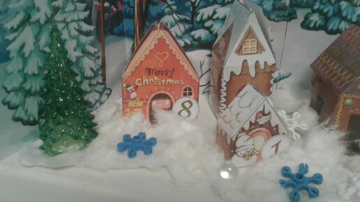 Все наслышаны об адвент -календарях для детей, в преддверии Нового года. Я весь ноябрь была в поисках подходящего для сына варианта. И больше всего приглянулся мне календарь-домики, такая Новогодняя деревня...Главное, что создание не занимает много времени, а получается очень эффектно. Я распечатала домики, заламинировала и склеила так, чтобы можно было вытащить записочку от гномиков))) Какому -то домику крышу не доклеила, какому -то пол вырезала. Вот, что получилось... Добавила фон от макета...