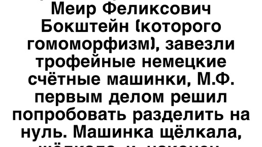 Забавные истории Забавные истории Когда в вычислительное бюро, которым заведовал Меир Феликсович Бокштейн (которого гомоморфизм), завезли трофейные немецкие счётные машинки, М.Ф. первым делом решил попробовать разделить на нуль. Машинка щёлкала, щёлкала, и, наконец, каретка вылетела. С тех пор стало ясно – на нуль делить нельзя! Забавные истории Пришли слесари, меняют стояк в ванной, шум, грязь, мат. Один из них подходит ко мне: Забавные истории Матушка заказала новый холодильник, а старый из квартиры повезут на дачу...