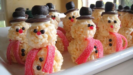 Сладких новогодних снеговиков можно делать из конфет, зефира, суфле, фруктов, мармелада и т.д. Хочу предложить рецепт снеговика из рисовых шариков . Вам понадобится: 450 г рисовых хлопьев;
