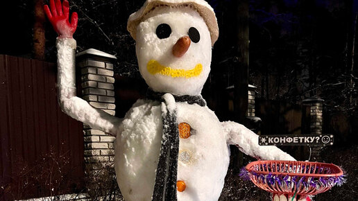 Мой снеговик раздаёт конфетки прохожим