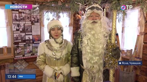 Наших зрителей продолжают поздравлять Деды Морозы из разных уголков России. Сегодня это чувашский Хель Мучи, что в переводе означает «Снежный дед». Кафтан и шапка у него тёмно-зелёные, украшены орнаментом. Хель Мучи прекрасно играет на национальных инструментах Посох тоже музыкальный. Есть у Деда и Снегурочка - по-чувашски Юр Пике – « Снежная Красавица». Серебряные монеты украшают ее шубу и головной убор - тухью, которую она носит вместо кокошника. Гостей Хель Мучи и Юр Пике принимают в своей резиденция - в туристической деревне «Ясна»...