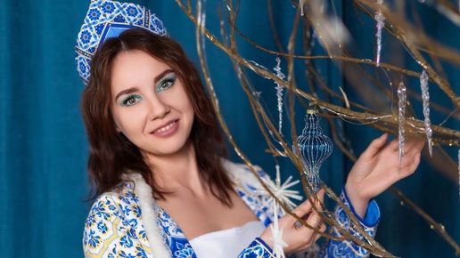 Снегурочка Виктория в дизайнерском костюме Скорнякова - бренд одежды на фотосессии в студии