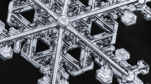 Симметричные крупные снежинки - это в природе редкость. Эта снежинка выделяется с точки зрения симметрии: редкий тип снежинки, которую нечасто встретишь. Симметрия в крупных снежинках - редкость, потому что, когда она растёт и начинает распространяться дальше от центра, скорее всего, вы обнаруживаете заметные перепады температуры и влажности от одного кончика до другого, в результате чего появляются изменения в характере роста отдельных лучей. Крупным планом: А здесь вы смотрите на тонкий...