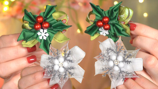 Две Новогодние Идеи Заколки Снежинка и Рождественская Веточка канзаши