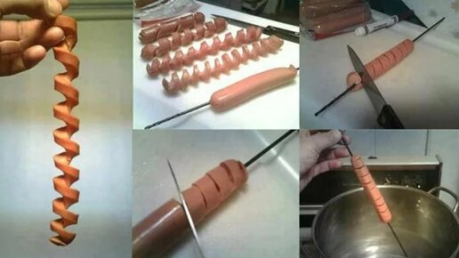 Ингредиенты: 6 сосисок; 40 г сливочного масла; овощи, салатные листья, кетчуп для подачи. Способ приготовления: Сосиски почистить от шкурки, а затем порезать, 1 вариант «спираль»: сосиску насадить на палочку для шашлыков, острым ножом, постоянно вращая палочку, прорезать спираль до палочки. Убрать шпажку и обжарить наши сосиски на раскаленном сливочном масле со всех сторон. После обжарки получится «пружинка». 2 вариант «осьминоги»: для этого необходимо надрезать сосиску с одной стороны до середины крест накрест, а затем также обжарить на растопленном сливочном масле до румяности...