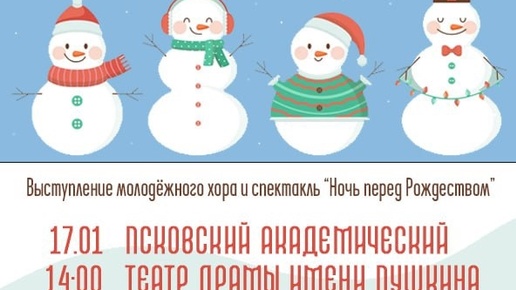 17 января 2026 года в Псковском академическом театре драмы имени А.С. Пушкина состоится выступление молодежного хора и показ спектакля «Ночь перед Рождеством», которые представят участники Молодежного центра Псковской епархии «Трилучье»...