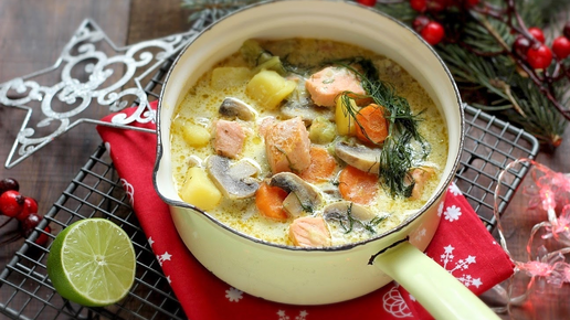 Если без супа в новогодние праздники вы своей жизни не представляете, то предлагаем вам рецепт прекрасного новогоднего супчика, что и на праздничный стол подать в такие праздники будет не стыдно. 2 средние моркови 200 гр. грибов репчатый лук 1 стебель сельдерея 2-3 шт. картофеля 1 ст. л. сливочного масла 200 мл сливок 250 гр. красной рыбы (можно брюшки, головы, хвосты) 1-2 лавровых листа 1 ч. л. измельченного свежего укропа соль, перец 1,5 л воды сок маленького лимона Растопите сливочное масло в кастрюле и обжарьте в нем нарезанный лук...