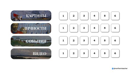 Год назад я перешерстила все социальные площадки с педагогическими разработками в поисках нормальной презентации для повторительно-обобщающего урока в 6 классе. Поиски были тщетны! Что ж, "Если гора не идет к Магомету, то Магомет идет к горе", поэтому я взялась за разработку большой, информативной, красивой презентации, которая будет хороша для завершения учебного года, подготовки к ВПР и ОГЭ. 1. Большая игровая презентация - включает в себя 24 задания по четырем темам: картины, личности, события, видео...