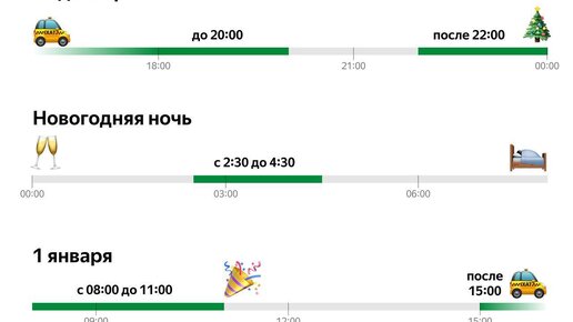 Цены на такси в новогоднюю ночь повышаются. На основе данных по использованию сервиса в 2023 году в «Яндекс Go» спрогнозировали, в какое время лучше заказывать поездки 1 и 2 января. «Cредний чек вырос на 25—30%». Как изменилась ситуация с такси и ценами после введения реестра Тарифы, из которых складывается стоимость услуги (одного километра и одной минуты пути), в сервисе перед Новым годом не меняются. Но на итоговую сумму поездки также влияют уровень спроса и количество свободных машин на линии: если желающих уехать больше, чем незанятых водителей, цена поездки может быть выше обычного...