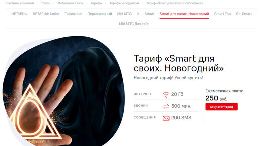 Разбираем новый тариф от МТС “Smart для своих. Новогодний” - 250 рублей за 20 ГБ трафика, много звонков и SMS. Но что МТС скрыл в описании? Привет. Близится сезон новогодних праздников, обычно в это время операторы предлагают скидки на существующие тарифы, чтобы перетянуть одеяло на себя. Несмотря на то, что операторы искренне считают, что гонка за количеством розданных SIM-карт окончена и мериться эффективностью в том, как засеивать улицы городов пластиком, уже нет надобности, не все поддерживают это начинание...
