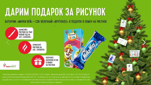 Доброго времени суток! Подтвержения информации в интеренете я не нашла, но на АЗС у моей знакомой спросили о наличие ребенка и рассказали об такой акции. Я так поняла она действует не первый год, по крайней мере в 2021 была. Картинка соответственно с той акции, но думаю все будет аналогично, вроде бы с 24 декабря стартует. Знакомой сказали просто рисунок и ребенок в комплекте, дадут сок и шоколадку, вроде бы даже заправляться не требуется. Ну разьве не прекрасный повод нарисовать новогодний рисунок...