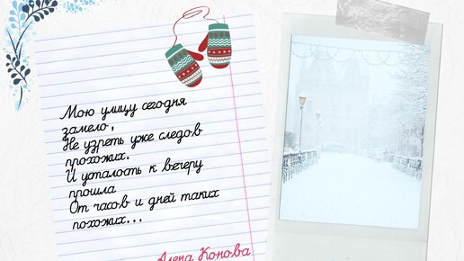 Мою улицу сегодня замело Мою улицу сегодня замело, Не узреть уже следов прохожих. И усталость к вечеру прошла От часов и дней таких похожих... За окном горят давно огни, В доме пахнет новогодней ёлкой. Этот вечер только для любви, Нет сегодня места недомолвкам. Расскажу я близким о зиме, Обниму их, сердцем согревая...