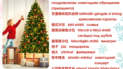 #zhidao_подборка_слов Тема: Новый год (新年 xīnnián) 🥂 🔸新年气氛 xīnnián qìfēn новогодняя атмосфера 🔸音乐 yīnyuè музыка 🔸舞蹈 wǔdǎo танец 🔸新年贺词 xīnnián hècí новогоднее поздравление; новогоднее обращение (президента) 🔸克里姆林宫的自钟 kèlǐmǔlín gōng de zì zhōng кремлевские куранты 🔸俄式沙拉 éshì shālā оливье 🔸甜菜丝鲱鱼沙拉 tiáncài sī fēiyú shālā селёдка под шубой 🔸甜菜根沙拉 tiáncàigēn shālā винегрет 🔸桔子 júzi мандарины 🔸焰火 yànhuǒ фейерверк 🔸新年晚会 xīnnián wǎnhuì новогодний концерт 🔸公司新年联欢会 gōngsī xīnnián liánhuānhuì новогодний корпоратив 📝 Ссылка на карточки Quizlet для изучения новых слов: https://quizlet...