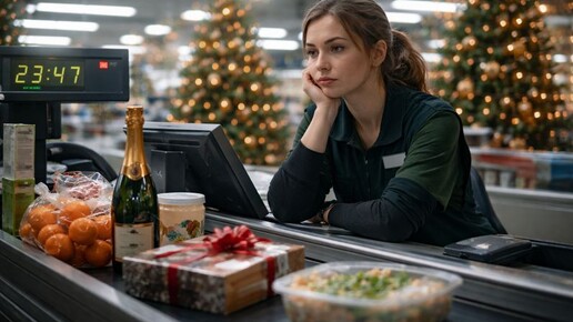 В магазине всегда одинаковый свет. Белый, чуть усталый, без праздников и выходных. Он не становится мягче от гирлянд и не теплеет от мишуры — просто горит, как горел вчера и будет гореть завтра. Она стояла за кассой уже восьмой час. Ночная смена 31 декабря — время особенное: вроде бы ещё не праздник, но уже и не обычный день. Часы на табло показывали 21:47. До Нового года оставалось чуть больше двух часов, и это «чуть больше» тянулось бесконечно. Она смотрела на ленту: хлеб, мандарины, майонез, шампанское...