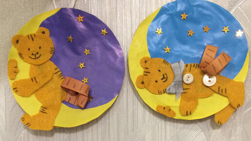 Через месяц Новый 2022 год. Год Тигра. В связи с этим предлагаю сделать вместе с детьми подвеску на елку "Тигр на луне". Для поделки нам понадобится следующий материал: 1). Цветная бумага двусторонняя (желтая и синяя); 2). Фетр для тигра (оранжевый); 3). Гелевая ручка (черная); 4). Пайетки или глиттеры или наклейки в виде звезд; 5). Атласная ленточка для бантика; 6). Пуговицы на лапки у тигра; 7). Клей - карандаш, клей ПВА или горячий клей; 8). Ножницы; 9). Тени косметические (коричневые). Из синей двусторонней бумаги вырезаем круг...