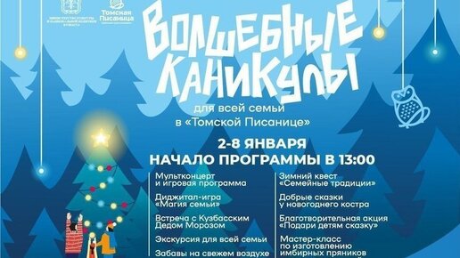 Как год начнёшь, так его и проведёшь! Мы верим в эту примету и готовы вместе с вами начать 2024-ый сказочно и дружно, одной большой кузбасской семьей. Со 2 по 8 января для всех посетителей музея пройдут ВОЛШЕБНЫЕ КАНИКУЛЫ для всей семьи в «Томской Писанице». В программе события: Мультконцерт в исполнении «Бременских музыкантов» и игровая программа с героями русских сказок Диджитал-игра на большом экране «Магия семьи» Встреча с Кузбасским Дедом Морозом Экскурсия для всей семьи Забавы на свежем воздухе...