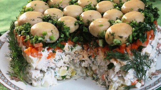 №1 Слоёный салат "Лесная поляна" или "Грибная поляна". ▪Ингредиенты: Картофель (в мундире) - 350 г Куриная грудка копчёная - 500 г Лук красный - 100-150 г Морковь (отварная) - 300 г Яйца (отварные) - 6 шт. Огурцы маринованные или солёные (по желанию) - 100-150 г Сыр твёрдый - 350 г Опята маринованные (без жидкости) - 350 г Укроп зелень - по вкусу Лук зелёный - по вкусу Майонез - по вкусу Соль - по вкусу Чёрный перец - по вкусу ▪ Для маринада: Соль - по вкусу Сахар - 1 ст.л Яблочный уксус 9% - 2 ст...
