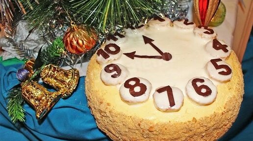 Торт Часы на Новый год 2020 Ингредиенты Для двух коржей: Для крема: Для коржа под цифры: Для украшения: Как приготовить Хорошо промываем и замачиваем изюм. Готовим бисквит. Взбиваем яйца с сахаром. Отдельно смешиваем сметану и сгущенное молоко (половину банки), добавляем к яичной смеси и хорошо перемешиваем Добавляем просеянную муку с гашеной содой, перемешиваем до однородного состояния Делим тесто на 2 части. В одну добавляем какао и измельченные грецкие орехи, перемешиваем. В светлое тесто добавляем изюм, перемешиваем...