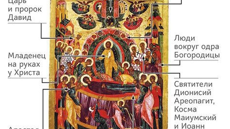 Тропарь праздника В рождестве́ де́вство сохрани́ла еси́,/ во успе́нии ми́ра не оста́вила еси́, Богоро́дице,/ преста́вилася еси́ к животу́, Ма́ти су́щи Живота́,// и моли́твами Твои́ми избавля́еши от сме́рти ду́ши на́ша. Перевод: ...