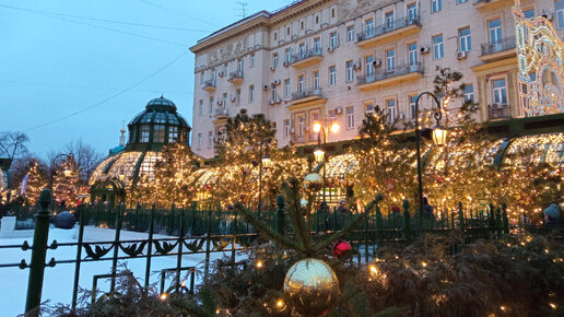 Вчера я рассказала, как украшены к Новому году Манежная и Театральная площади, а также площадь Революции. Сегодня речь пойдёт о Тверской площади. Здании мэрии выглядит довольно аскетично для праздника, его украшают только две стилизованные ёлки, стоящие у входа. Уличные мачты освещения на Тверской улице украшены уже ставшими традиционными для Москвы панно в виде бокалов с шампанским. Площадь полностью задействована в новогоднем шоу. По её периметру установлены павильоны, в которых проходят мастер-классы для детей или устроены магазинчики по продаже сувениров и сладостей...
