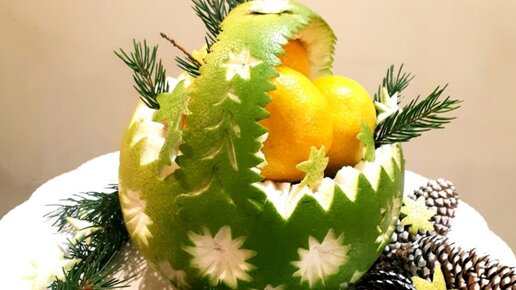 Новогодний стол хочется накрыть как-то по-особенному, что-то изменить. Каждая хозяйка накрывает стол по своему, сегодня я покажу, как еще можно украсить новогодний стол. Вырезаем из памело корзину Памело разделила на две части визуально, вырезала сначала узоры на нижней части памело, а потом вырезала ручку корзины и вытащила содержимое (мякоть) памело. На этот раз, мне не повезло, памело переспелое и невкусное попалось. Узоры аккуратно вырезала, а в корзину мандарины сложила. Сначала я поставила корзину с мандаринами на подставку, а вокруг расположила шишки...