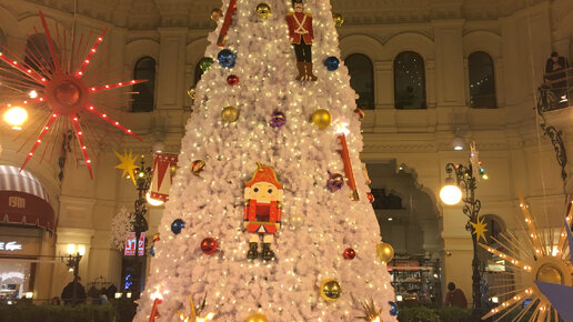 В этом сезоне ГУМ к новогодним праздникам был украшен по мотивам сказки Эрнста Теодора Амадея Гофмана "Щелкунчик и Мышиный король". Впервые эта рождественская сказка была опубликована в 1816 году. Главные сказочные персонажи - Фриц и Мари - дети советника медицины Штальбаума - получают в сочельник от родителей множество подарков: кукол, игрушечных гусар, деревянного коня, крошечную посуду, книжки с картинками. Крёстный Дроссельмейер преподносит им миниатюрный за́мок с золотыми башнями, по залам которого передвигаются дамы и кавалеры...
