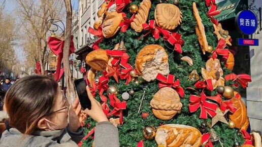 В Харбине поставили новогоднюю ёлку, украшенную хлебом