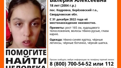 В Свердловской области в поселке Кедровка, в Березовском городском округе в новогоднюю ночь пропала 18-летняя девушка. Валерия Щупова ушла из дома 31 декабря 2022 года, сообщили в поисковом отряде «Лиза Алерт». Известно, что в день пропажи девушка была одета в темно-синюю куртку, черные легинсы, темные ботинки и шапку. Если вы знаете, где может находиться Валерия, позвоните, пожалуйста, по телефонам указанным в ориентировке...