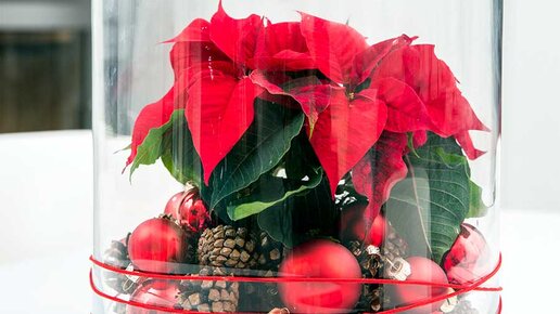 Размер стеклянной вазы должен быть чуть больше размера горшка с пуансеттией...