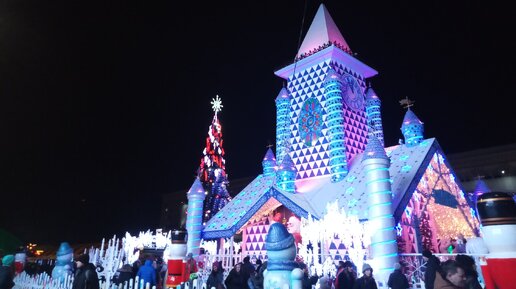 Это не то что домик, это целый дворец Деда Мороза. Он настолько большой, что увидев его даже взрослым захочется зайти внутрь. Онисовершенно бесплатный, но надо простоять в очереди. Пускают по 6 детей. Возле входа домик охраняют зайцы. Песенки, танцы, стишки - все что бы детки не замерзли...