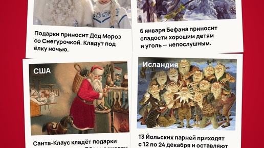 !🎅❄ В России Дед Мороз в шубе и с посохом, сопровождаемый Снегурочкой, оставляет подарки под ёлкой, воплощая славянские мифы и европейское влияние. В США и Великобритании пухлый Санта-Клаус на санях с оленями наполняет чулки у камина; в Италии добрая ведьма Бефана на метле разносит конфеты и уголь; в Исландии 13 йольских парней с разными характерами — от воров до шутников — приносят сюрпризы в ботинки...