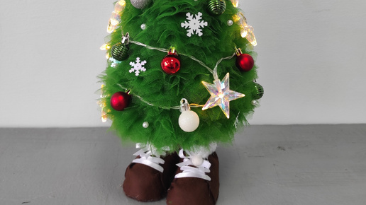 Идея для творчества ! Ёлочка-светильник Для начала из картона готовим форму самой ёлки. Делаем устойчивые ножки. Треугольную форму ёлки обелеиваем зелёной тканью и обшиваем фатином. Делаем обувь из фетра...