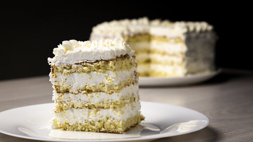 Рецепт очень вкусного торта на Новый Год "Снежная королева", Торт получается очень нежным за счет бисквитных коржей и крема из взбитых сливок.