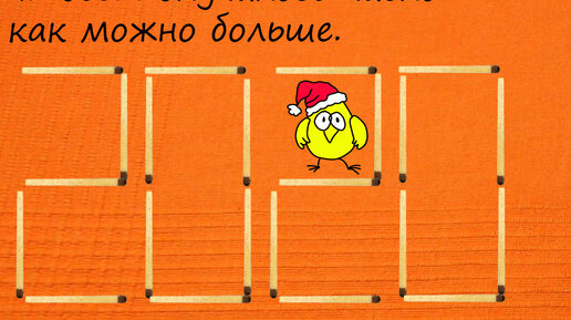 Для занятий математикой не нужно специальных поводов, но если повод есть -- тем лучше! А Новый Год -- несомненно, прекрасный повод порешать задачки. Неувядающая классика Задачки со спичками развивают качества, которые не прививаются в школьной математике. Здесь невозможно применить готовый алгоритм решения, а надо проявить упорство и сообразительность; перепробовать и оценить несколько вариантов. У этой задачки про число 2020 нет заранее заданной цели -- получить то-то и то-то. Построив пример, надо постараться придумать другой, еще лучше, а это всегда очень трудно...